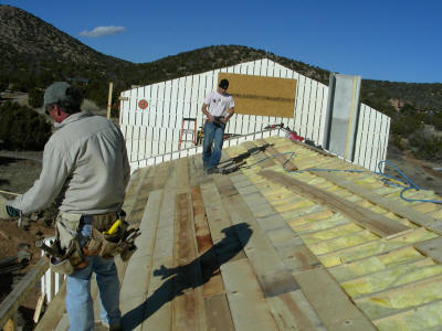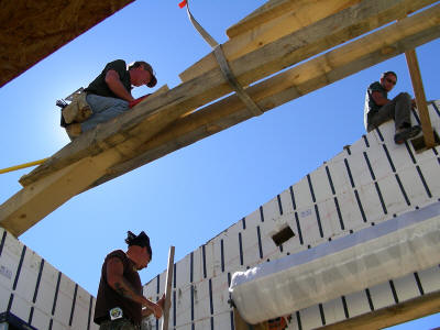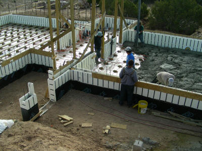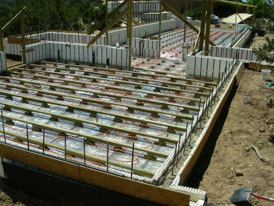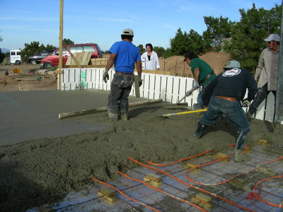 slab sleepers, bubble/foil insulation and radiant piping; concrete pour: tucking in the mud; concrete pour: initial leveling follows