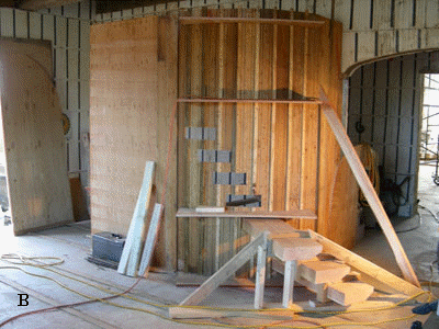 B. Studio stair form: This form was made out of scraps of form plywood and lumber previously used in the forming of the exterior walls. I laid out the